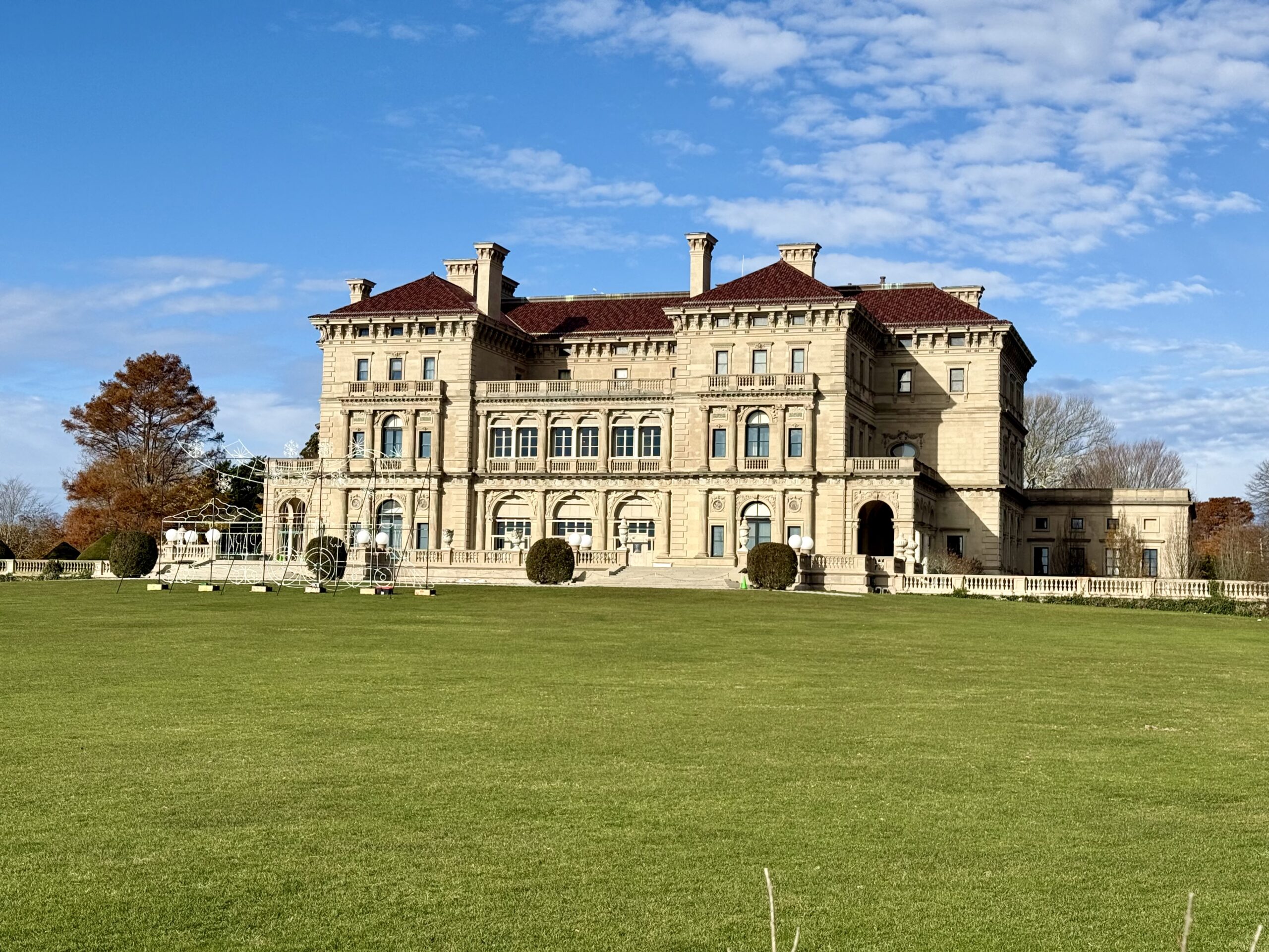 A wide photo taken from the back lawn of The Breakers in Newport Rhode Island. The mansion rises above the grass with detailed stonework, tall arched windows, and sweeping terraces. The open lawn, trimmed gardens, and nearby shoreline highlight the elegance of the historic Vanderbilt estate.